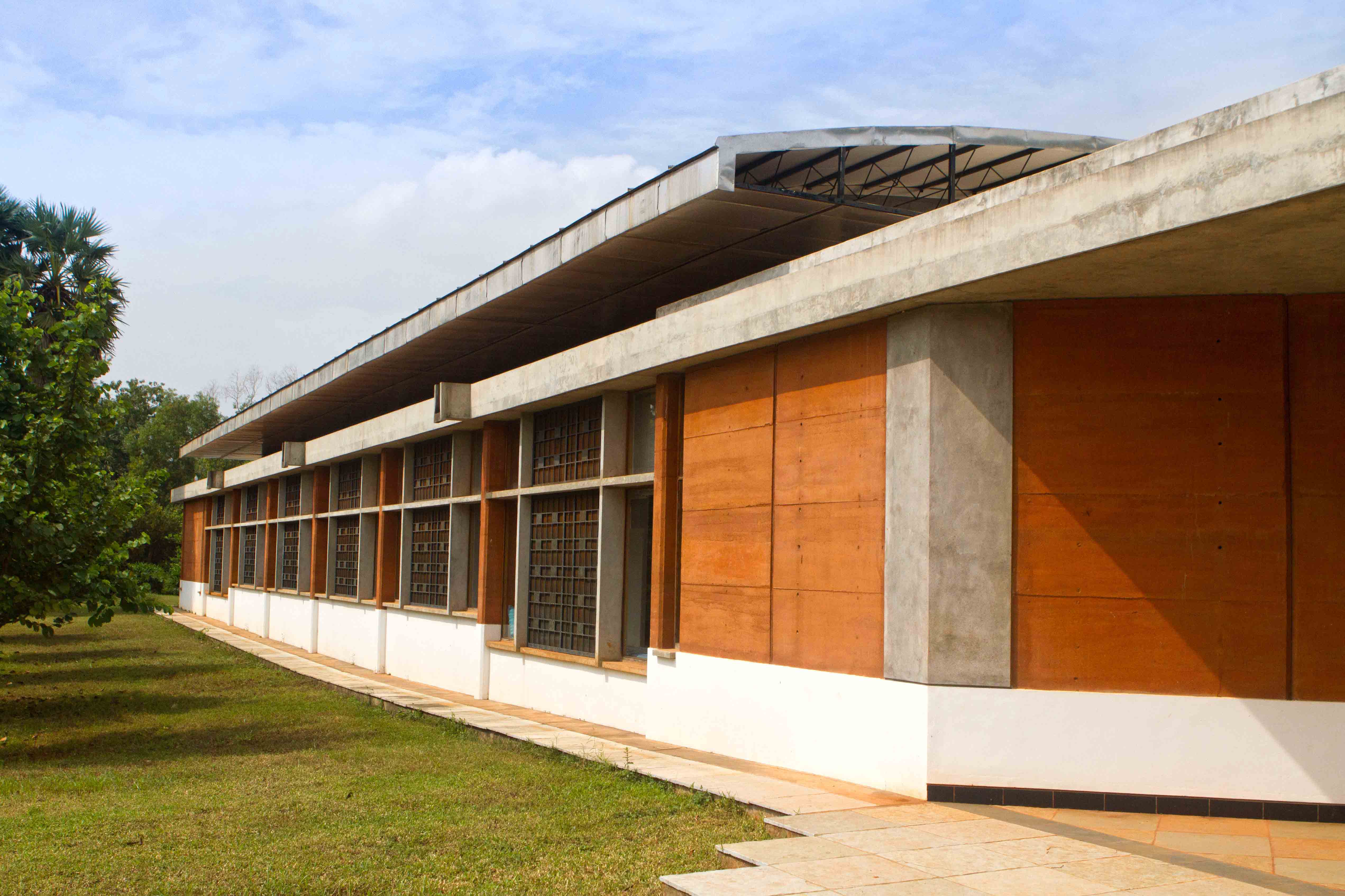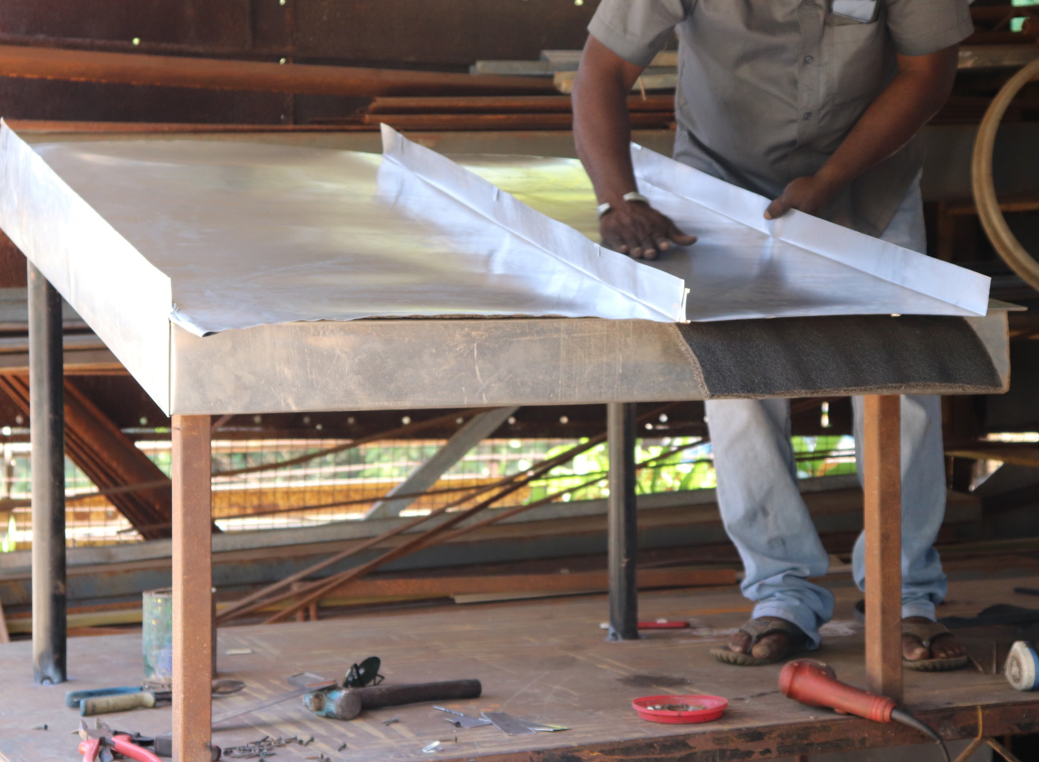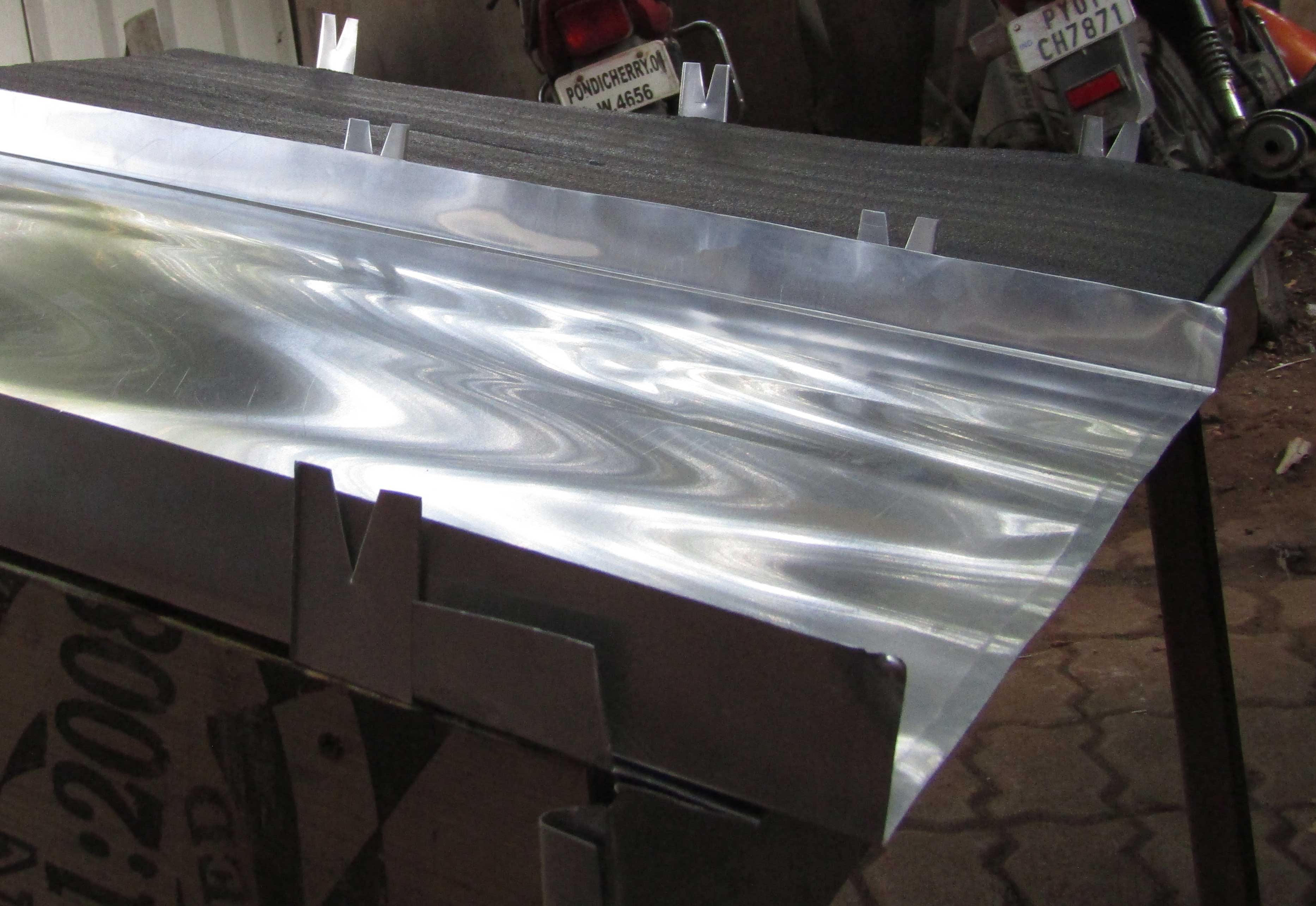 In Auroville, some of us have been designing and building aluminium (corrugated and non-corrugated sheets) roofing since the late 90s as we had a highly skilled resident metal roof craftsperson who trained a handful of local metal fabricators of grills and gates. The design of the roof shape combines various aspects like the structure, function of the building, economy and timeline along with ascetics of form and proportion. As the heat transfer is high during the day, it is desirable to have good insulation that is adapted with the false ceiling. This also helps with the noise of the rain that can be quite deafening otherwise. In some parts of the world the metal roof is disconnected from the insulation by a maintaining a gap of 4-6 inches allowing for air flow as heat exchange. The anodized sheet develops a weathered patina within one seasonal cycle, making it less reflective to prevent reflected glare to the surrounding, and retaining enough reflectivity to prevent heat gain.